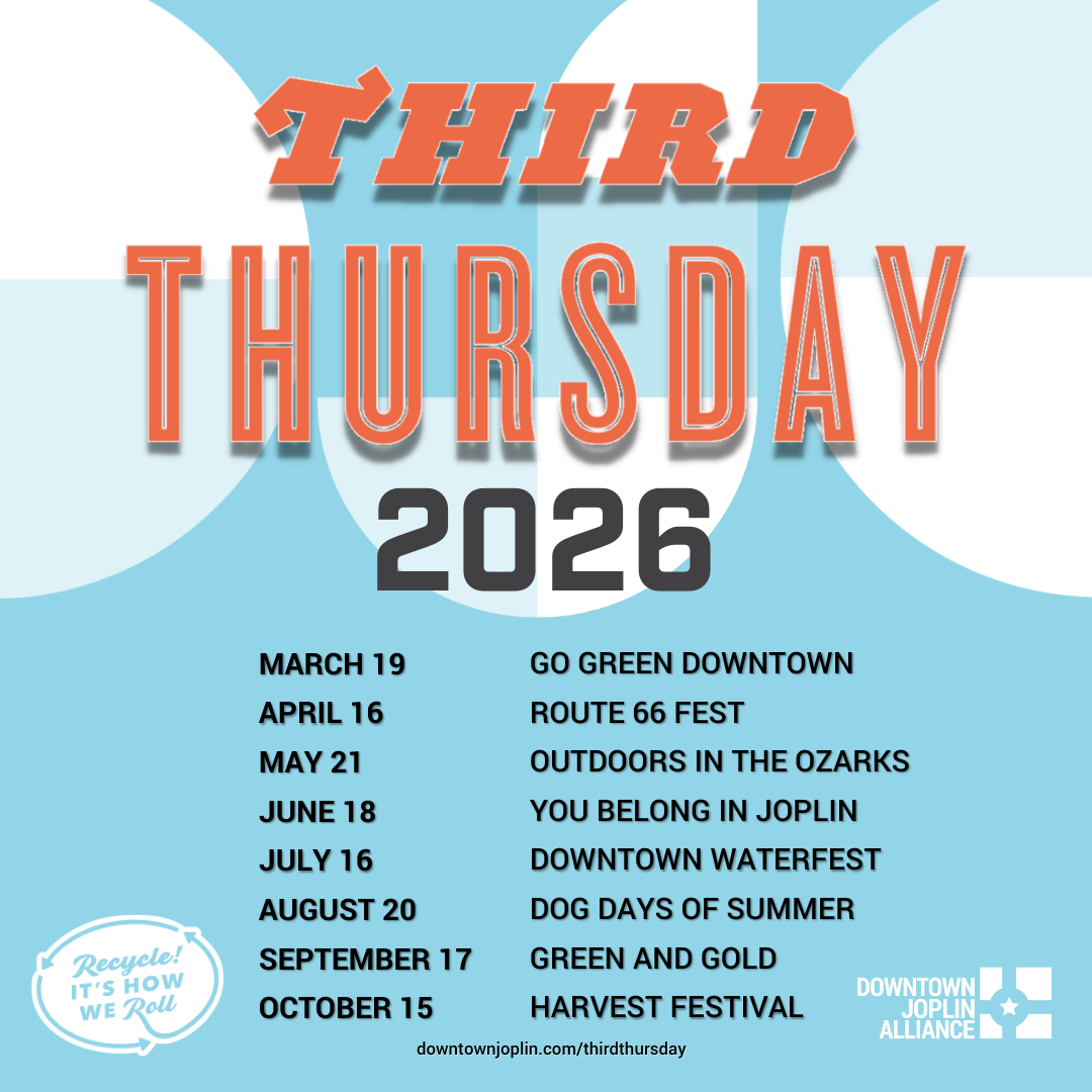 Third Thursday is Joplin’s premiere community cultural event. Every Third Thursday, March through October, thousands of people gather on Main Street in Downtown Joplin from 5:30pm to 8:30pm to enjoy local artisans, music, entertainment, and food.